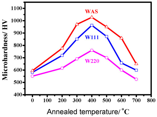At 400 °C, the microhardness of WAS reached 1028 HV. However, the microhardness for W220 was only 760 HV because its W content is lowest (see Table 2). Over 400 °C, the microhardness decreases along with the annealed temperature because of the coarsening crystal grains.