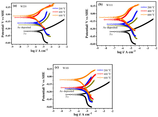 Figure 8 shows the Tafel curves of the three textured Ni–W alloy coatings of W220, W111 and WAS that were as-deposited and annealed at different temperatures in air for 2 h. And, the corrosion potential (Ecorr) and corrosion current density (Icorr) were obtained by the Tafel extrapolation method and are given in Table 4. It can be seen that the Ecorr saw a positive shift after these three textured Ni–W alloy coatings were electrodeposited onto the Q235 carbon steel disks, implying improved corrosion resistance [24]. The more the annealed temperature elevated, the more the Ecorr for all the samples is positively shifted. For the WAS sample, its Ecorr is significantly positively shifted after heat treatment at 600 °C, likely due to the completion of the structural transformation from amorphous to crystalline and the elimination of internal stress, which results in cracks in Ni–W obtained in an ammonium-citrate bath [17]. The ΔEcorr was calculated according to the difference between the samples and Fe blank electrode. The ΔEcorr is 165 mV, 139 mV and 112 mV for the as-deposited W220, W111 and WAS samples, respectively. That is, the value of ΔEcorr gradually decreases along with the increase in W content in Ni–W alloys. It was found that Icorr becomes high after coating Ni–W alloys, possibly because the galvanic coupling of Fe and Ni–W accelerate the corrosion of Fe in porous coatings. For every sample, the Icorr decreases along with the increase in annealed temperature. In general, the Icorr of the W220 sample is the lowest, which suggests that W220 possesses the best corrosion resistance. Alimadadi also reported that the corrosion resistance of single-phase Ni–W is superior to amorphous and dual-phase coated layers because of cracks or internal stress [26].