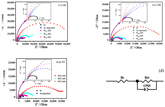 Nyquist plots of as-deposited and annealed (a) W220, (b) W111 and (c) WAS; (d) is an equivalent circuit.