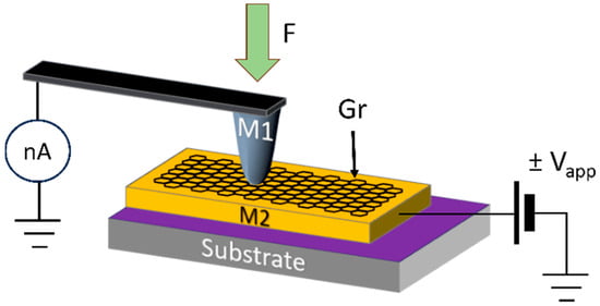 Metal–graphene–metal stacked structure was investigated under the applied force with a constant electric field set between metal electrodes. The stack was constructed on a standard Si plate with an insulating SiO2 layer (thickness dSiO2 = 275 nm) (SIEGERT WAFER Gmbh, Aachen, Germany). A thin Au layer was formed on the Si plate using DC magnetron sputtering. Commercial chemical vapor deposition (CVD)-grown graphene monolayer (Graphenea) was then transferred via standardized wet transfer method on the Au film []. Pt probe (Pt-rock, model RMN12Pt400B, Bruker, Billerica, MA, USA) was placed on top of the structure and used as an electrode for measurements. The second electrode was the Au film with thickness up to 100 nm, where the voltage was applied, and the polarity changed with respect to the Pt probe electrode. The schematics of sample composition are shown in Figure 1.