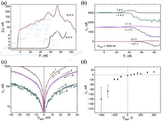The applied external voltage-induced changes in electric charge within the M-G-M interfaces can have a significant impact on the electrical contact between the layers []. These changes can be detected by measuring the electrical current IT in F-ramp mode while the SPM probe retracts. Figure 5 illustrates the dependencies of IT on the probe-sample force under different applied voltages.