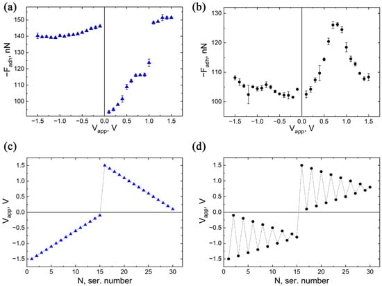 Dependence of the tip–surface interaction force at the jump-off triangle apex in the SPM force curve experiments on external applied DC voltage (a,b). Corresponding to the (a,b) step-like change in magnitude of Vapp with increasing serial number of the force curve cycle in the consecutive measurement of the tip-surface interaction force are shown in (c,d), respectively.