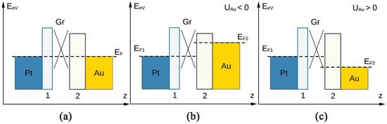 Scheme of a flat band model explaining the charge transfer mechanism in metal—graphene—metal system at the equilibrium (a) and under positive (c) and negative (b) voltages applied to the graphene supporting gold film. The top electrode is a flat Pt probe.