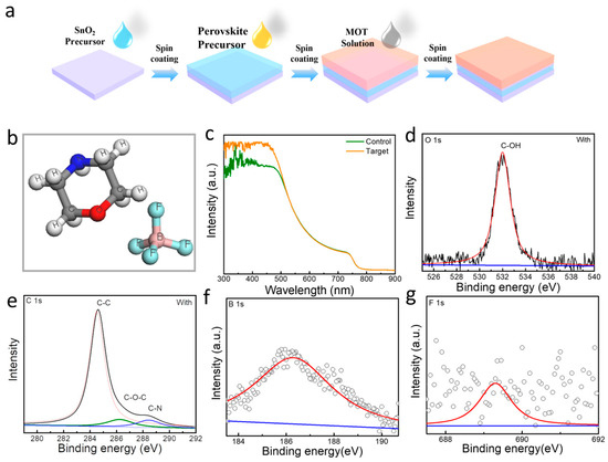 (a) Schematic diagram of the fabrication process of perovskite films with MOT. (b) 3D chemical structure of MOT. (c) UV-Vis absorption spectra of the perovskite solutions without and with MOT. Full XPS spectra and narrow scans of (d) O 1 s, (e) C 1 s, (f) B 1 s, and (g) F 1 s for thin films of perovskite without and with Morpholine Tetrafluoroborate (MOT).