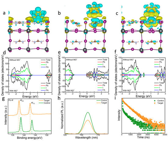 Chemical structure of MOT. Charge density difference of MOT passivated FAI–terminated FAPbI3 surface with VFA (a), VI (b) and Ii (c). PDOS of passivated FAI–terminated FAPbI3 surface with VFA (d), VI (e) and Ii (f) in the presence or not of MOT. (g) The XPS spectra for Pb 4f from the with and without MOT modified perovskite films. (h) PL and (i) TRPL spectra of perovskite films from the perovskite films with and without MOT–modification.
