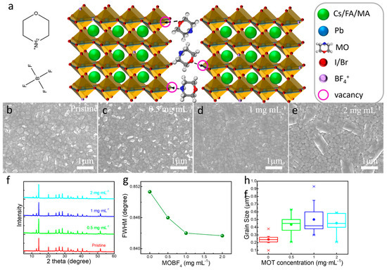 (a) Working mechanism and chemical composition characterization of films. (b–e) SEM image of the films of different concentration treatment. (f) XRD patterns (g) Corresponding FWHM of perovskite films based on different MOT concentration. (h) Statistical graph of grain size of perovskite films based on different MOT concentration.