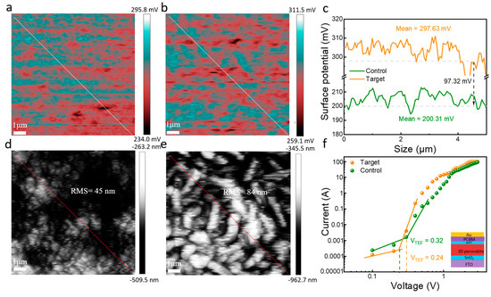 KPFM image of (a) with and (b) without MOT–modified perovskite films. (c) Contact potential difference along the solid white lines drawn in (a,b). AFM image of (d) with and (e) without MOT–modified perovskite films. (f) The structure (FTO/SnO2/Perovskite/MOT/PCBM/Au) of the electron-only device is shown in the inset.