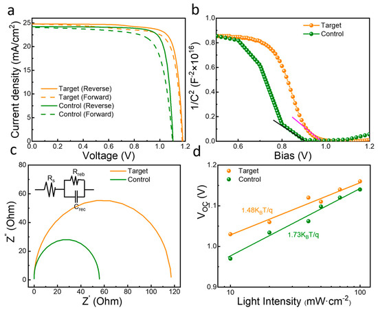 (a) J–V curves of the devices without and with MOT measured in RS and FS. (b) Mott–Schottky plot for control and MOT-modified PSCs. (c) Nyquist plots of the control and MOT-modified PSCs measured in the frequency range from 1 MHz to 1 Hz at 0 V bias under dark. (d) Light-intensity-dependent VOC of the control and MOT modified PSCs.