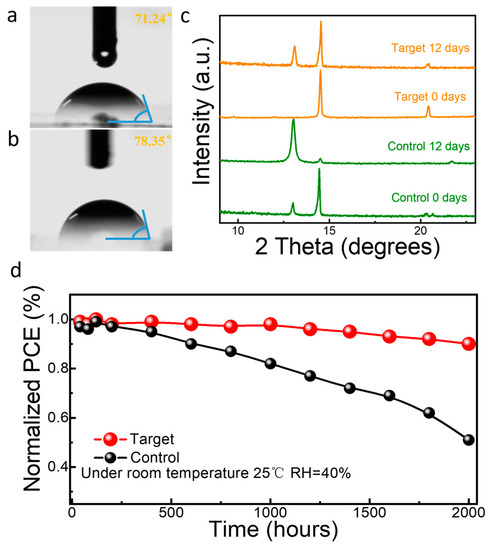 Water-contact-angle measurement of (a) control (b) with MOT-treated perovskite films. (c) XRD patterns of perovskite films stored in high humidity (80 ± 10% RH) for 12 days. (d) Normalized PCE stability curves of control and modified devices at 40% RH.