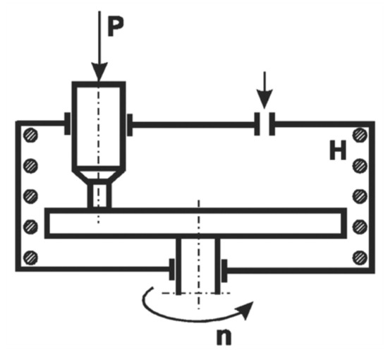 The Ra roughness parameter was measured using a Surftest SJ210 profilometer (Mitutoyo). Abrasive wear resistance was evaluated using the ball-on-disc method on the T11 device (Łukasiewicz Institute for Sustainable Technologies). The tribosystem consists of the stationary pin (ball) pressed at the required load (P) against the disk (tested sample) rotating at the defined speed (n). The friction couple is inserted in the insulated test chamber (Figure 2) [24].