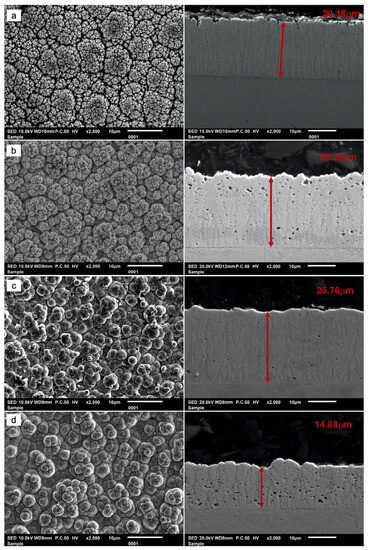 The produced coatings are characterized by diverse surface morphology. It is affected by the coating deposition from baths with different concentrations of the dispersion phase in the form of boron particles. The surface of the Ni-B coating without embedded boron particles resembles a cauliflower structure (Figure 4a), which is typical of electroless Ni-B coatings [17,26,27]. The formation of the Ni-B layer occurs in the process of chemical reduction of nickel ions in the presence of a reducer. The most commonly used reducing agents in this type of process are sodium borohydride NaBH4 and dimethylamino borate (DMAB). Baths containing DMAB can work at lower temperatures and in a wider pH range, and are less sensitive to changes compared to baths containing sodium borohydride [14]. However, NaBH4, due to its chemical properties, can only be used in alkaline baths, but it provides a higher reducing capacity compared to DMAB. The high efficiency of NaBH4 stems from its ability to provide more electrons. In addition, coatings deposited from baths containing NaBH4 have better properties compared to other reducing agents. These properties include higher hardness and better mechanical properties [7]. The process of chemical deposition of Ni-B coatings is multi-stage and occurs in varying conditions depending on the chosen reducer [26]. The structure of the Ni-B coating is columnar and becomes nodular as the layer develops [7]. The columnar structure of the Ni-B coatings is clearly evident in cross-sections perpendicular to the surface. In the case of alloy coatings, like Ni-B, selecting the deposition process parameters, such as bath volume, surface area of the coated element, bath temperature, mixing speed, and deposition time, is crucial. All these parameters influence the structure of the deposited coating. Another study [13] presents the investigation of supplementing the bath composition during the coating deposition process. This treatment aims to maintain constant concentrations of bath components throughout the process and prevent a decrease in yield. Refilling the bath also helps ensure that the pH remains at the right level. Lowering the pH below 12 leads to the formation of nickel boride (Ni2B), which can cause the self-decomposition of the bath. In this study, the authors selected the process conditions (deposition time, bath volume, sample surface, bath temperature, and mixing speed) to obtain homogeneous coatings with a thickness of approx. 20 µm without the need for bath composition supplementation during the coating production process. The embedded particles of the dispersion phase (B) cause changes in the surface morphology, while the cauliflower-like structures transform into spherical ones. This is due to the embedding of particles and agglomerates of the dispersion phase powder, which, during the process, are gradually encapsulated by the Ni-B matrix. The built-in particles of the dispersion phase in the microscopic images are visible as black dots both on cross-sections and on the surface of the produced composite coatings. Changes in the morphology of Ni-B/B composite coatings are related to the embedding of the boron particles and depend on the amount of dispersion phase particles in the bath [28]. The growth of the coating and the integration of the dispersion phase particles are simultaneous. Integration of the dispersion phase particles within the matrix contributes to the formation of new growth centers [17]. The effect of the concentration of boron particles in the bath on the quantity of built-in boron particles (the dispersion phase) in the fabricated Ni-B/B composite coatings is presented in Table 2.