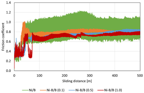 Friction coefficient as a function of sliding distance for Ni-B and Ni-B/B coatings.