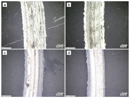 Images of damage after tribology test of Ni-B and Ni-B/B coatings: (a) Ni-B; (b) Ni-B/B (0.1); (c) Ni-B/B (0.5); (d) Ni-B/B (1.0).