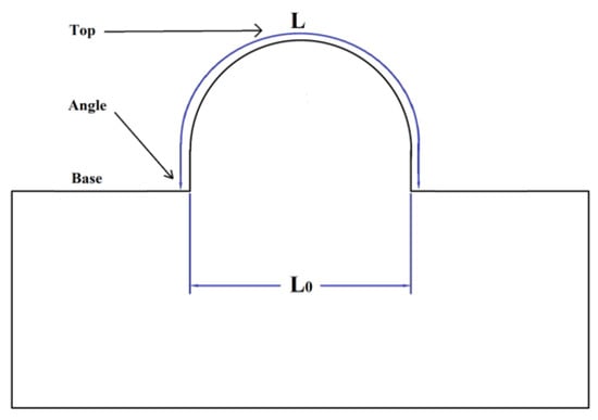 A tabletop vacuum thermoformer (Jintai) was used for thermoforming. Molds with nominal strains of 20, 60, and 100% were CNC milled from aluminum blocks. The nominal strains of the molds were calculated according to Equation (1). L and L0 (1 cm) are shown in Figure 1. Molds were designed to allow stretching in one direction only. The resistance (R) of the prints was measured using a multimeter to calculate the resistance increase according to Equation (2). The normalized resistance increase is calculated according to Equation (3).