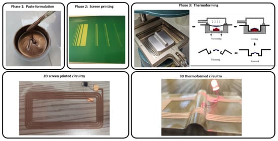 Among the different thermoforming methods, vacuum thermoforming is one of the most common variants. In this method, a 2D thermoplastic sheet is clamped in an airtight frame, then softened by heating through radiation or convection, drawn against a mold using a mechanical lever, and finally pressed against the mold using a vacuum. After cooling down, the component, which retains its final shape, is removed from the mold, and trimmed. The temperature range of this process depends on the substrate used but typically ranges between 120 and 200 °C. Due to its ease of use, thermoforming, along with other additive manufacturing methods, is gaining traction in producing free-form electronic component prototypes for control components in automotive and medical industries [4,5,6], antennas [7,8,9,10,11,12,13], sensors [14,15,16,17], diodes [18,19], solar cells [20], LED array [21] and epidermal electronics products [22,23,24,25].