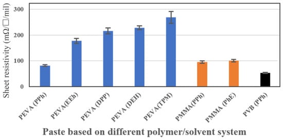 Sheet resistivity for pastes with identical formulations made from different polymer/solvent systems.