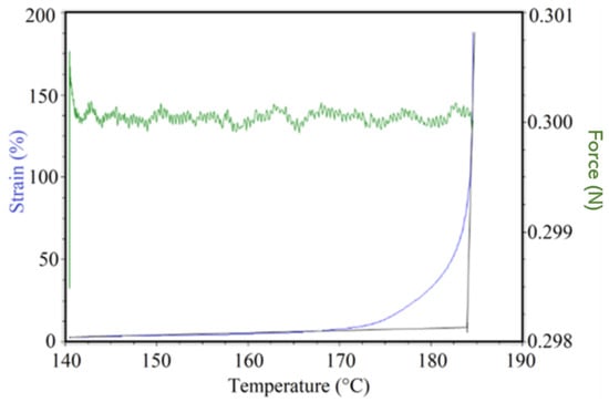 Variation in strain for PC film with printed paste on top at a constant load of 0.3 N versus temperature, showing ~184 °C as the onset temperature for the softening of PC sheets with printed paste on top.