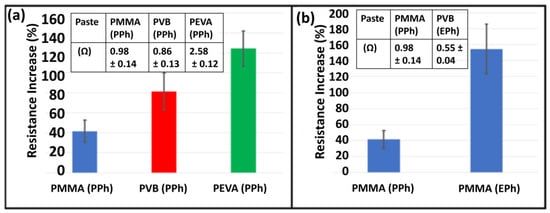 Resistance increase after thermoforming with the 20% strain mold for (a) identical pastes made from PMMA, PVB with PPh as solvent (b) identical pastes made from PMMA and two different solvents: PPh and EPh. The insets show average resistance values before thermoforming.