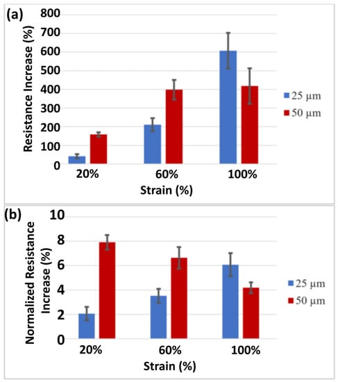 As seen in Figure 6, a paste made from PMMA(PPh) yielded the least resistance increase after thermoforming on the 20% strain mold; therefore, we further investigated the electrical performance of this paste after being thermoformed at even higher strains, i.e., 60% and 100%. In addition, we also investigated the effect of print thickness on the electrical performance of this formulation after thermoforming using two different screens with 25 and 50 μm emulsion sizes. The screen-printed traces were then dried in an oven and thermoformed using 20, 60, and 100% strain molds. The results of their resistance increase are shown in Figure 6a. As expected for both thicknesses, resistance increase goes up at higher strains. However, the rise in resistance increase is much less pronounced for the thicker print, i.e., 50 μm, and it plateaus at higher strains. This trend is more evident in Figure 6b, in which normalized values of the resistance increase are plotted. Normalized values are calculated by dividing the increase in resistance values by their corresponding strains, and they signify the proportion at which resistance increase values go up vis-a-vis strain increase. The figure clearly shows that the values of normalized resistance increase go up with increasing strain for 25 μm prints, unlike the 50 μm prints, the values for which go down. We attribute this finding to the reinforcing effect of the paste printed on top of the substrate. Since these pastes are practically polymeric composites printed on top of PC substrates, they can increase the force required for conforming the films onto the molds as their thickness goes up. It should be noted that for samples with sharp angles of the thermoformed films, we observed that samples with 50 μm thickness do not fully conform to these sharp angles, and as such, the actual strain imposed on the traces is lower in the case of the 50 μm prints compared to the 25 μm ones, despite the nominal values being the same. This highlights that thicker prints have a higher resistance against deformation, hence causing the molding process to be less conforming.
