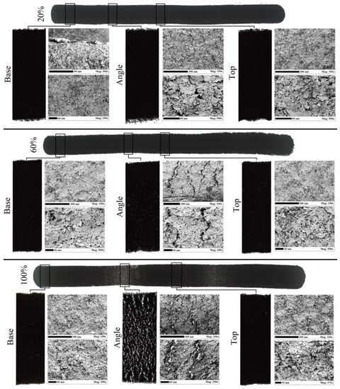 Low-magnification light microscope images for pastes molded on 20% strain mold (top), 60% strain mold (middle), and 100% strain mold (bottom). Higher-resolution light microscope images were taken from three locations for each sample: at the base of the mold, at the 90% angle, and at the top of the mold. SEM micrographs were taken from three locations as well, similar to high-magnification light microscope images.