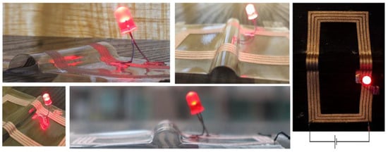 Once we have established the printing compositions and the thermoforming process, we evaluated the feasibility of obtaining a functional thermoformed device. To demonstrate this, we used conductive inks composed of Ag-coated Cu flakes, with PMMA dissolved in PPh, to print an RFID antenna on PC substrates. After thermoforming (Figure 8) using the 60% mold, it was found that the continuity was not affected and an LED could still be lit, although the total resistance was increased from 11 ± 1 to 44 ± 8 ohm. In addition, it was found that the thermoformed antenna could be used for RFID communication, while the readability did not show any drop using a 13.56 MHz chip from a distance of 1 cm.