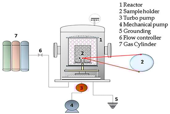 Figure 1 shows the PECVD system (a homemade reactor) used to prepare the DLC coatings, consisting of a cylindrical chamber made of stainless steel, fitted with a cathode fed by a pulsed or continuous discharge source. A homemade capacitive DC power supply was connected to the sample holder, and the bias voltage (Vb) was adjusted by controlling the power level and the pulse. Selection of the correct power supply pulse width was crucial for generating the species and for reducing the free ions pathway, whereby the ions collided with the substrate. The vacuum system comprised a turbo pump (Avaco-Pfeiffer Hipace 300—São Paulo, Brazil), and an auxiliary mechanical pump (Edwards E2M18—Barueri, São Paulo, Brazil), coupled to a homemade deposition chamber, enabling attainment of pressures as low as 0.0013 Pa. Electronic controllers (Avaco-Cole-Parmer—Sao Paulo, Brazil), calibrated for each gas, were used to regulate the injected gas flow. Before deposition, the samples were cleaned for 30 min using an argon plasma with a Vb of −500 V, a flow rate of 12.0 sccm, and a working pressure of 0.39 Pa. Silicon samples were used as a film interface to anchor the DLC on the surface of the metallic substrate.