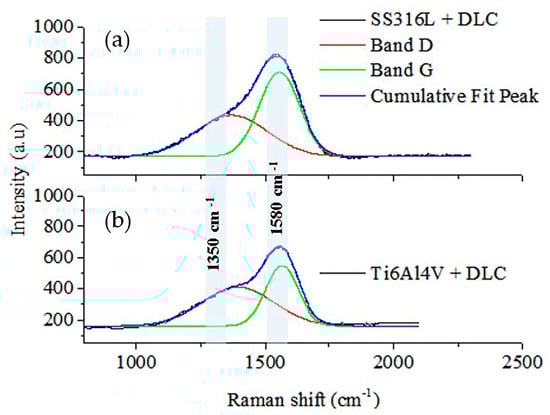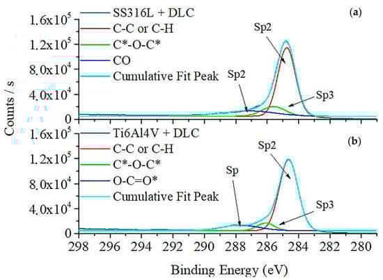 Figure 4 shows the XPS spectra for the DLC coatings. The spectra were dominated by the C1s bands, providing information on the chemical bonding environment and the components of the DLC. The SS316L spectrum presented three main bands, corresponding to C–C/C–H at 284.8 eV, C=O=C at 285.8 eV, and C–O at 287.4 eV [28]. The Ti6Al4V spectrum showed main bands corresponding to C–C/C–H bonds at 284.6 eV, C–O–C at 285.9 eV, and O=C=O at 287.4 eV [28,29]. The binding energy values found for the sp2 and sp3 components of the C1s spectra were consistent with the binding energies reported in the literature for the peaks corresponding to graphite and diamond [30]. The presence of oxygen in the chemical bonds found in the analysis was due to residual air in the vacuum process applied before deposition of the DLC coatings. The presence of oxygen in DLC films could lead to bonds resulting from chemical corrosion during tribocorrosion tests.