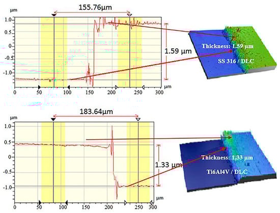 Measurement of the thicknesses of the DLC coatings on the SS316L and Ti6Al4V substrates.