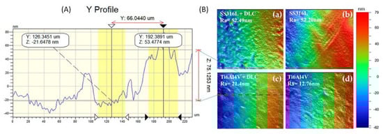 (A) Ti6Al4V+DLC profile; (B) roughness analysis of the DLC coatings deposited on the SS316L and Ti6Al4V substrates: (a,b) SS316L substrate with and without DLC coating; (c,d) Ti6Al4V substrate with and without DLC coating. The colors indicate the peaks and valleys on the surface (the dimensions are shown in the color bar on the right side of the images).