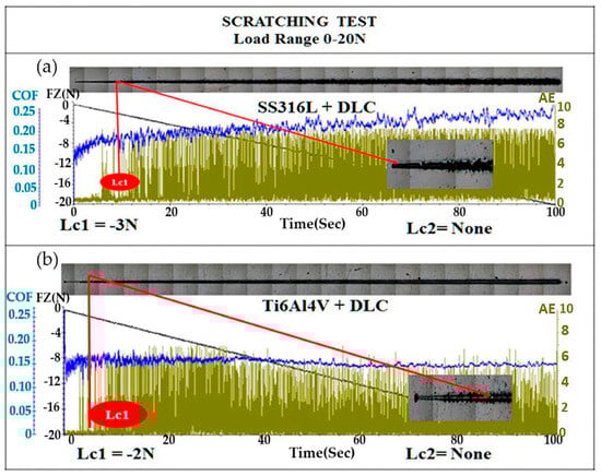 Figure 7 shows the results for adherence, which was evaluated using the scratch test. The test was performed with a diamond tip, in accordance with ASTM C1624-05 [32]. An optical microscopy image of the scratch track on the SS316L substrate coated with DLC is shown in Figure 7a. The first crack occurred after 8 s, at a critical load (Lc1) of −3 N, indicated by the red line, with the image showing progressive failures in the form of waves in that region. The first critical load (Lc1), which is indicated by the first sign of damage or cracks in the coating, without substrate exposure, was evidenced by the increase in the acoustic emission signal (green line), as well as by failures shown in the optical microscopy image. The second critical load (Lc2) is related to the complete failure of the coating [7,8]. The DLC-coated SS316L sample showed no substrate exposure (Lc2) up to a force of 20 N. In the case of the DLC-coated Ti6Al4V sample, there was also no substrate exposure (Lc2) up to 20 N, although the Lc1 occurred at −2 N.