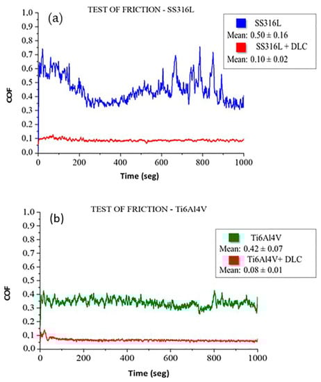 The friction test results for the Ti6Al4V and SS316L substrates with and without DLC coatings show that the protective DLC coating reduced the friction in both cases, with similar values obtained, considering the error bars.