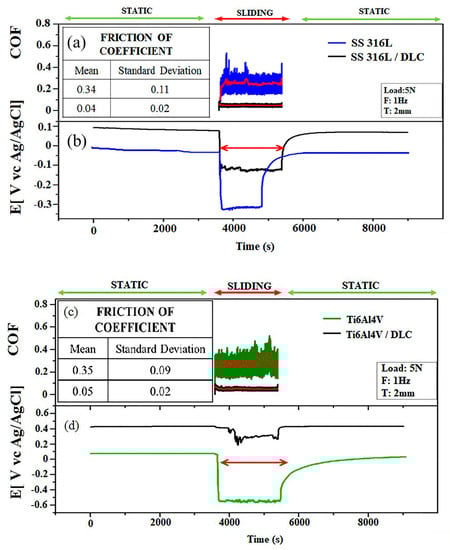 In terms of tribocorrosion susceptibility, the results (Figure 9b,d) show that the Ti6Al4V was two times more susceptible to corrosion than SS316L, while the presence of the DLC coating provided greater protection to Ti6Al4V, compared to SS316L, since the potential showed a more significant decrease for SS316L compared to Ti6Al4V. The different behaviors of the DLC films as protective coatings could be related to an effect of the surface roughness, which differed for the two substrates (Figure 6).