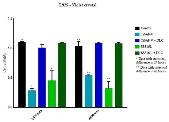 Figure 10 shows the results of the crystal violet assays of cell viability after 24 and 48 h for the control, SS316L, SS316L+DLC, Ti6Al4V, and Ti6Al4V+DLC groups. At 24 h, the Ti6Al4V group showed a statistically significant difference from the control group (p < 0.0001); however, there was no significant difference between the Ti6Al4V+DLC and control groups, indicating similar cellular growth. For the 48 h exposure, the Ti6Al4V group presented a statistically significant difference to the control group (p < 0.0001), with decreased cell viability. The higher cell viability value at 48 h reflected cell division that occurred after the 24 h period. The Ti6Al4V+DLC group was not statistically different from the control, indicating that these groups remained constant regarding cell proliferation.