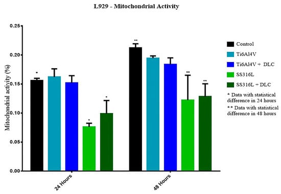 Results of the mitochondrial activity assays after exposure of the cells to the Ti6Al4V and SS316L samples, with and without DLC coatings, for periods of 24 and 48 h.