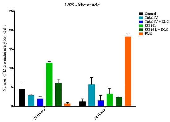 For the 48 h period, a statistically significant difference was observed between the Ti6Al4V group and the control group (p < 0.0001); however, the Ti6Al4V+DLC, SS316L, and SS316L+DLC groups showed no significant difference when compared to the control group. In comparison to the EMS group, all the other groups were significantly different, evidencing probable non-genotoxicity, considering the substantial micronucleus formation in the EMS group, while much lower micronucleus formation occurred in the other sample groups.