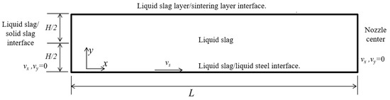 This study focuses on continuous casting machines in a certain steel factory. The mold length is 900 mm, and the slab section is 1800 mm × 220 mm. Considering the symmetry of the steel flow and the geometric characteristics of the liquid slag layer, the calculation area length is 900 mm, and the boundaries on both sides of the calculation area are the narrow surface of the mold and the center of the nozzle, which is 1/2 of the width of the casting billet, as shown in Figure 1. The thickness of the liquid slag layer is related to the temperature of the molten steel, effective heat transfer coefficient of mold powder and melting rate. During the casting process, the thickness of the liquid slag layer may fluctuate slightly due to the influence of steel flow from the narrow surface of the mold to the direction of the water inlet. In this study, the fluctuation of the slag steel interface is ignored, and it is believed that the interface between liquid slag and steel is straight and stable.