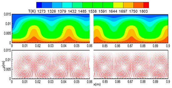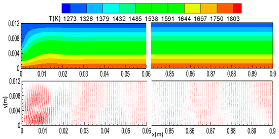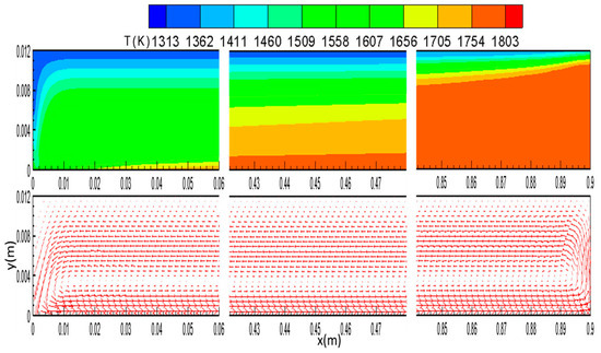 The flow and heat transfer conditions of the slag layer with a thickness of 10–18 mm were calculated without considering the shear velocity at the bottom of the slag caused by the flow of molten steel. When the thickness of the slag layer is 12 mm, the temperature field and velocity vector distribution inside the slag layer are shown in Figure 2. The buoyancy caused by the temperature distribution and density difference of liquid slag will drive the liquid mold flux near the narrow copper plate to produce convection, and the maximum flow speed is 0.0487 mm/s. When the distance from the narrow surface of the mold exceeds 14 mm, the flow velocity of the protective slag is also relatively small, and the heat transfer is mainly carried out in the casting direction.