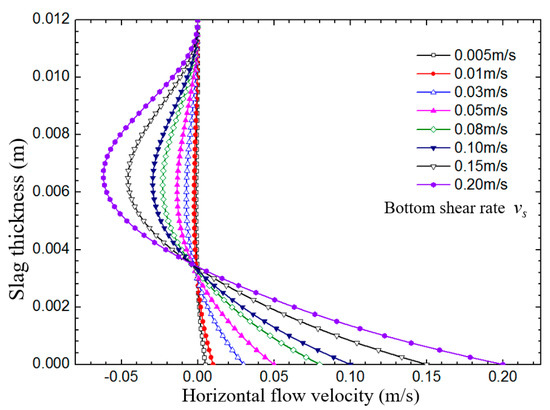 When the thickness of the slag layer is 12 mm, at a distance of 450 mm from the center of the water inlet, the relationship between the horizontal flow velocity of the liquid slag in the thickness direction and the shear velocity is shown in Figure 5. It can be seen that with the increase of bottom shear velocity, the horizontal flow rate of liquid slag significantly accelerates. At a distance of 0.003~0.0035 m from the bottom of the slag layer, the flow direction of the liquid slag has changed. Taking this position as the boundary, the flow direction above it is from the mold nozzle to the narrow surface, with a wider area but a lower flow rate; the flow direction below it flows from a narrow surface to the nozzle, with a narrow area. However, due to being closer to the molten steel, the temperature is high, and the viscosity is low, resulting in a relatively high flow velocity in the horizontal direction. At a distance of about 0.00625 m from the bottom of the slag layer, the flow velocity towards the narrow surface of the mold reached its maximum value. When the bottom shear velocity increased from 0.005 m/s to 0.20 m/s, the maximum flow velocity increased from 0.0012 m/s to 0.0617 m/s. Within the range of 0.001 m from the top of the slag layer, the flow velocity of the liquid slag is almost zero. This is because the temperature at the top of the slag layer is low, the viscosity is high, and the flow ability of the liquid slag is relatively poor.