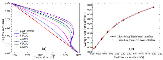 If the flow velocity in the reflux zone of molten steel is relatively small, the less active liquid surface is difficult to provide sufficient heat to the protective slag, thereby affecting the melting and subsequent inflow of the protective slag. If the velocity of the reflux zone on the molten steel is large, it is not conducive to the stability of the slag/steel interface, which can easily cause slag entrapment and affect the surface quality of the casting billet. Figure 7a shows the distribution of liquid slag temperature in the thickness direction in the central region of the model, and the relationship between the average heat flux of the liquid slag/steel interface and the liquid slag/sintering layer interface with the change of bottom shear velocity is shown in Figure 7b. When the shear speed is small (0.005~0.01 m/s), the longitudinal and horizontal flow velocities of the protective slag in the slag layer are relatively small. The heat transfer inside the slag layer is mainly through thermal conduction, and the temperature of the liquid slag layer is approximately linearly related to its distance from the interface. The average heat flux density between the liquid slag/steel liquid and the liquid slag/sintering layer interface is also small. When the bottom shear speed increases from 0.005 m/s to 0.2 m/s, the interfacial heat flux density of the liquid slag/steel liquid increases from 0.094 MW/m2 to 0.272 MW/m2, and the variation range of the interfacial heat flux density of the liquid slag/sintered layer is 0.096 MW/m2 to 0.273 MW/m2, which are very close. The difference in heat flux density is caused by weak heat transfer in the horizontal direction. Overall, with the increase of shear velocity, the heat conduction and convection inside the slag layer are significantly enhanced, and the temperature gradient inside the slag layer and interface heat flux density are significantly increased. The larger the bottom shear velocity, the wider the range of temperature fluctuations. The results are consistent with those of Neelakantnan, Mcdavid and Macias [8,9,10].