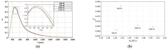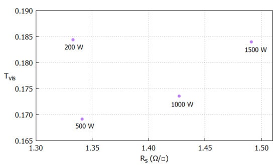 The spectra corresponding to these samples can be visualized in Figure 8a. Once again, the difference is relatively small, but the sample at 200 W is consistently higher than the rest. Figure 8b shows the visible transmittance factor plotted against the sheet resistance. The sample at 200 W exhibits a higher transmittance, while the 500 W sample has lower Rs and, consequently, a lower emissivity.