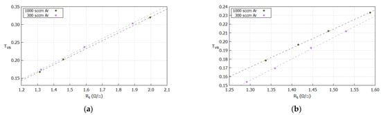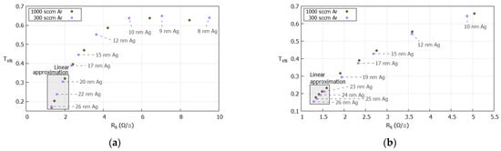Tvis vs. sheet resistance for varying silver thicknesses (data marked as “linear approximation” in Figure 3): (a) using 200 W; (b) using 500 W. The dashed line represents the linear fit when varying the silver thickness under each deposition condition.