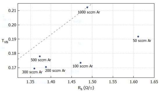In this way, we can observe that, in the series in which the argon flow varies (Figure 5), when the sample at 1000 sccm is displaced parallel to the obtained trend, it remains higher than the other samples. This indicates that, via the adjustment of the silver thickness of the sample at 1000 sccm to achieve the same sheet resistance as the sample it is being compared to, a higher transmittance would be obtained than that of the reference sample.