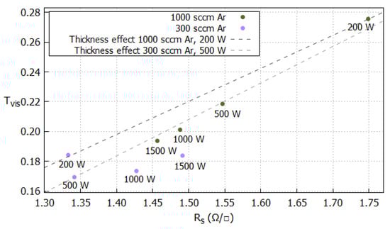 Among the samples within the same series, the deposition conditions remain constant, and only the thickness of the deposited silver varies. At 200 W, the results at both flow rates are very similar, while, for 500 W, the samples at 1000 sccm show a higher transmittance, compared to those deposited at 300 sccm flow rates and the same power. Focusing on the range in which approximating to a linear trend is acceptable, the results are presented in Figure 4. Through applying these linear adjustments for each deposition condition, it is possible to eliminate the impact of depositing varying silver thickness. This allows us to compare samples that do not share the same Tvis or Rs values.