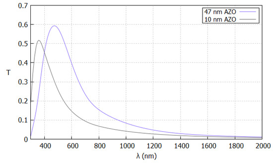 In this subsection, we analyze the results obtained for samples resembling those commercialized in the industry. These samples were deposited on glass, and the thickness of the AZO layers was increased to 47 nm. As a result, the high-transmission zone shifted toward longer wavelengths, as shown in Figure 7. Consequently, the resulting spectrum is more centered in the visible range, which is the desired outcome in low-emissivity coatings.