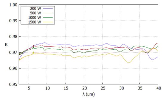 For these samples, which are designed to resemble low-emissivity coatings, reflection spectra in the mid-infrared range were obtained, Figure 9. All samples exhibited an emissivity of approximately 97%, with only minor differences observed among them. Notably, the samples deposited at 200 and 500 W showed the highest reflectance, which is consistent with our previous findings.