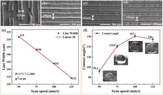 (a–d) Scanning electron microscope images of the prepared micron-level structures at 50 mm/s, 75 mm/s, 100 mm/s, and 125 mm/s laser scanning speed, scale bar: 500 μm; (e) Fit of the laser scanning speed versus the scan trajectory line width; (f) Contact angle characterization of the surfaces prepared with different scanning velocity parameters.