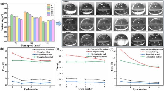 (a) Change in contact angle of the prepared surface with different scanning parameters after cyclic bending. Evaluation of the time to begin to freeze, completely freeze, begin to melt, and completely melt in the process of cyclic icing and melting for surfaces prepared at (b) 75 mm/s, (c) 100 mm/s, and (d) 125 mm/s.