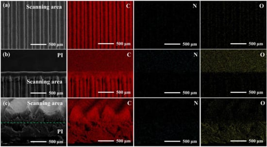 According to the SEM analysis and hydrophobicity and mechanical stability analyses of the prepared surfaces at 75–125 mm/s in the previous section, the 75 mm/s sample showed a regular surface morphology, special hydrophobicity changes, a stable delayed icing effect, and fast melting efficiency in combination with the requirements of subsequent electric deicing. The composition, morphology, and Joule thermal properties of the surfaced prepared under these conditions were further tested. The distribution of elements on the hydrophobic surface prepared at a scanning speed of 75 mm/s was observed. The EDS test diagram in Figure 5a–c shows the distribution of C/N/O elements in the material. Figure 5a shows the surface test map of the scanning area, where there is a significant difference in C element density between scanning trajectory and gaps. However, the overall distribution is consistent with the SEM diagram. According to Figure 5b, the scanning area exhibited a significantly higher concentration of C element than that on the PI film, while N and O elements were present in lower concentrations. A distinct boundary line was formed by the distribution of elements at the scanning area and interface region of the PI surface. The EDS test diagram of the cross-section in Figure 5c shows a similar phenomenon to that in Figure 5b, which confirms that the original structure of PI was destroyed, photothermal effect will occur on the surface of polyimide film after laser irradiation, and C-H, C-O, C=O and C-N in the film will be broken and atoms will be rearranged, the O, N, and H atoms diffuse into the external environment in the form of a gas, and the C atoms combine to form a graphene structure during the laser irradiation on the surface of the PI thin film [].