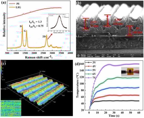 Results of surfaces prepared with laser scan parameters at 75 mm/s: (a) Raman spectra of PI films with the generated surfaces; (b) SEM images of the micron-structure graphene cross-sectional morphology; scale bar: 200 μm; (c) CLSM images of the micron-structure graphene surfaces on PI substrates, ×10; (d) Electrothermal connection mode and surface temperature-time variation curves of the micron-sized graphene surfaces at 3–7 V (interval: 1 V).