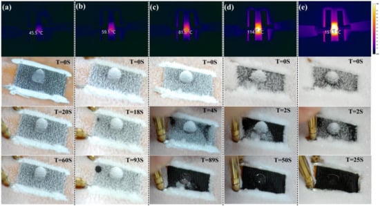 After the basic surface characteristic test and electric Joule thermal performance test, the deicing effect was tested. The surface was pasted on the semiconductor icing platform, and an HD camera was used to record the deicing effect. Figure 7 shows the test results. For the 4 V power supply, the frost in some areas could be melted within 20 s, and the ice could not be removed. With the 5 V power supply, the frost on the surface was melted within 5 s, and the completely frozen liquid droplets were melted into water droplets within 89 s. The 6 V power supply voltage could quickly heat up the frost on the surface within 2 s and complete the ice melting within 60 s. The 7 V supply voltage enabled defrosting and deicing in 30 s. Thus, the surface can achieve precise temperature control at 3–7 V and exhibits excellent hydrophobicity, stable electric heating performance, and controllable defrosting and deicing performance.